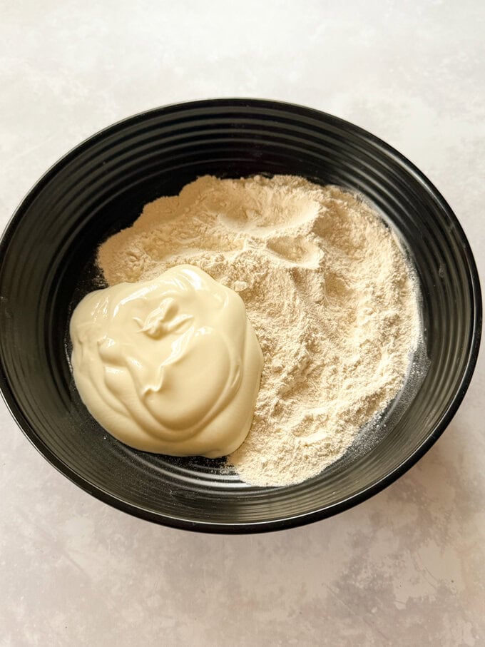 - Add self raising flour and greek yogurt to a bowl and mix well.