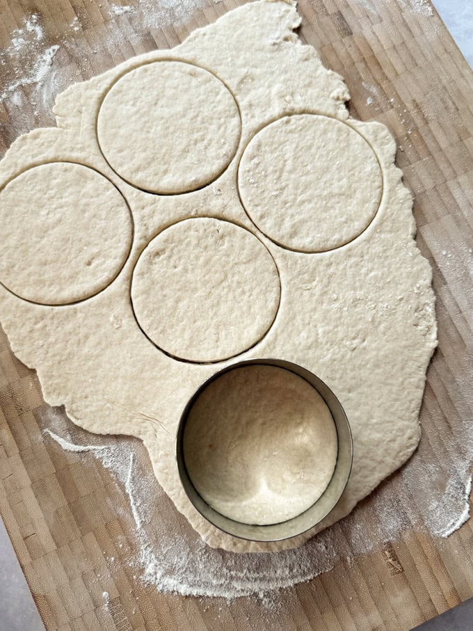 - Roll it out and cut out 8 circles approximately 8-9cm in diameter.