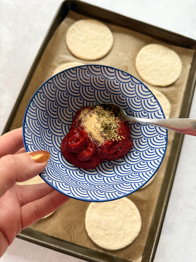 - In a bowl mix together the tomato puree, water, oregano and garlic granules. Spread a little of this on top of each circle.