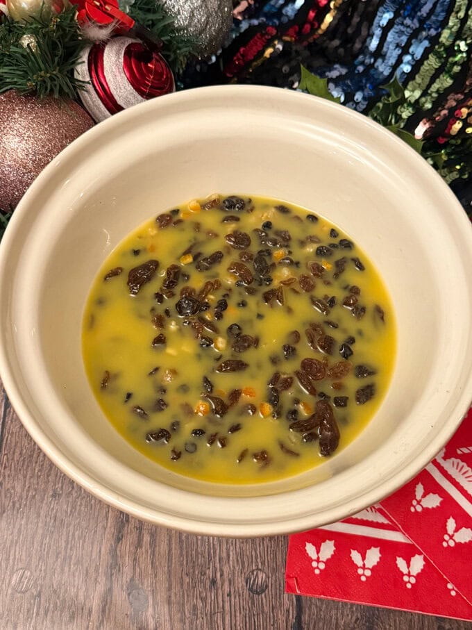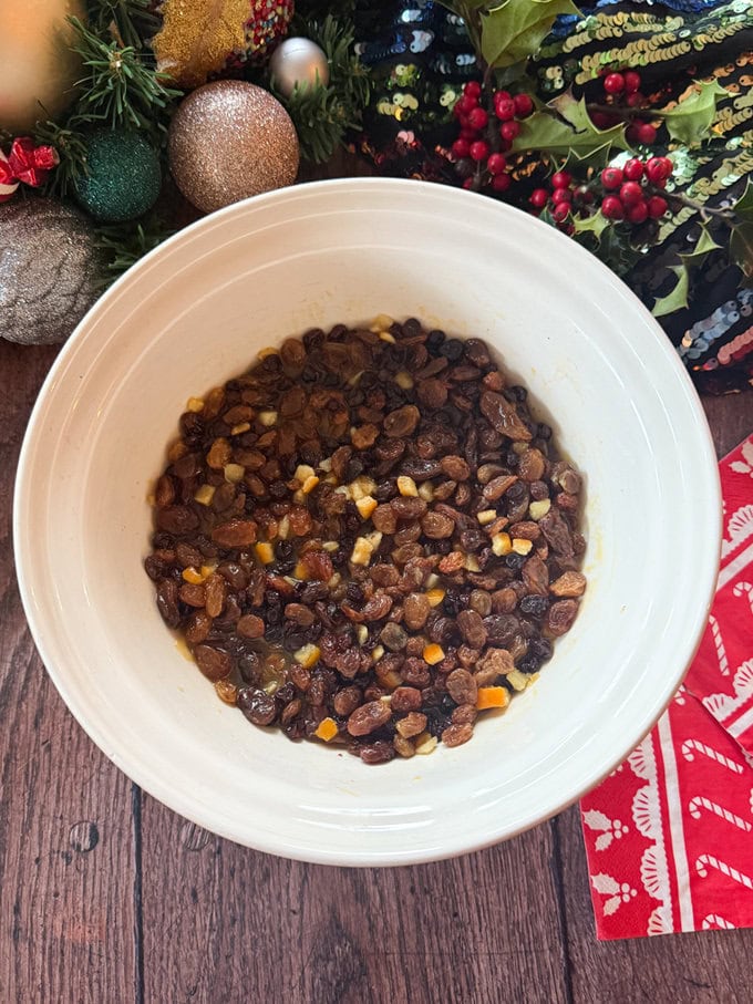 - Add the dried fruit and orange juice to a large bowl, cover with cling film or foil and leave in the fridge or somewhere cold overnight.