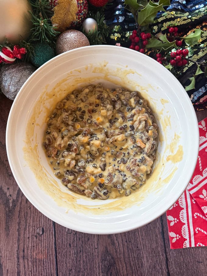 - Add the mixed dried fruit and orange juice to a large bowl and mix well.