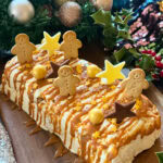 White Chocolate Semifreddo decorated with white chocolate stars,mini gingerbread men biscuits an drizzled with caramel sauce. sliced so you can see in inside.Surrounded by festive decor.