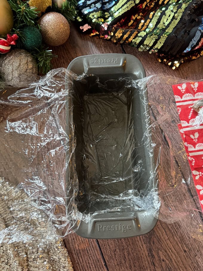 1. Grease a loaf tin really well with oil and then add a layer of cling film to it, ensuring there’s quite a bit of cling film hanging over both the left and right hand sides of the tin.