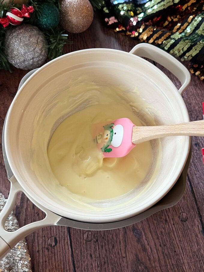 1. Add white chocolate to a bowl and place that over a pan of boiling water. Heat on a low heat on the hob, stirring until the chocolate has melted.