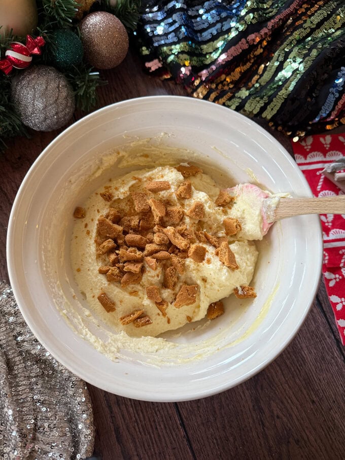 4. To the whipped cream add the melted white chocolate and broken up pieces of gingernut biscuits and fold in gently.